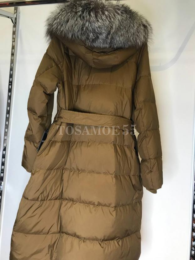 Длинный пуховик цвета хаки с чернобуркой
