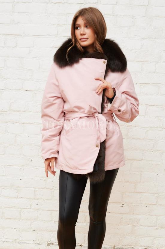 Розовая парка с воротником из меха песца